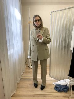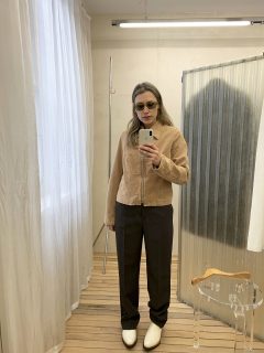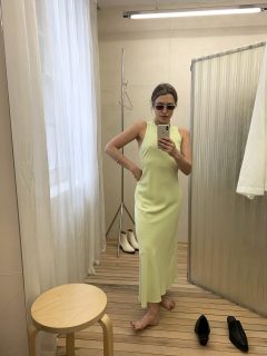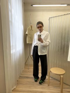 The staff are warm and welcoming. Store manager Jack took us through the women’s collection with clarity, whilst Ianthe pulled selections for a trying-on session in the pleasingly low-fi fitting room. Much like the menswear, the range explores a diverse range of materials. Classic womenswear pieces like dresses and skirts are off-set with more menswear rooted shapes. Tailoring reimagines the concept of power dressing in earthy linen while a silk biascut dress has zest in a shade of lime.