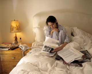 Pyjama icons are important. Winona Ryder in the nineties, with wet hair and a fresh pair of striped pyjamas is the goals of this look. Katherine Hepburn and Doris Day are also good references—and for the robe, you could (or not, your choice) obsessively study Zoe Kravitz eating cereal in the remake of High Fidelity. Whichever one of these you land on, remember that pyjama wearing is—first and foremost—about you doing you, they bring both comfort and style. So, thank you pyjamas for making me time happen. See you tonight.