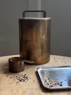 My brass tea caddy was purchased in Kyoto about 10 years ago, back when I used to spend a lot of time in Japan. I spotted it in a local tea shop in use, standing proud sentinel-like on a shelf alongside others just like it, each one containing different aromatics, grains, leaves and dried flowers. When I first purchased it, the gold colour had a pristine, mirror-like polish. With time and through use it has obtained the patina of a well-loved quality object.