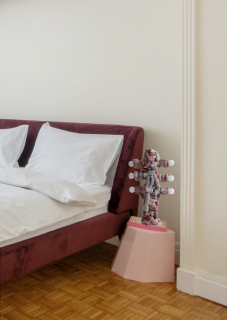 The current iteration is populated with unique articles by some of the gallery’s favourite makers—James Shaw’s recycled plastic homewares, in the form of a floor lamp or toilet roll holder, are elegantly gloopy and remain refined due to their modernist influences. Dotted throughout are Jochen Holz’s series of coloured lustre pendant lights made via the experimental technique of painting metallic oxides onto the molten glass—a perfect disruption to the pristine nature of the material. Each room has small and affordable additions by Martino Gamper. His familiar Arnold Circus stools act as casual perches and the salt + pepper spitz stand sharply by the kitchen sink, their form evoking the mountainous landscape of Gamper’s home region. The careful selection makes for a desirable abode—where design objects sing together to create an environment that is both practical and pretty. L’appartement is available to visit by appointment. For those seeking a more immersive experience, it is available to rent for short stays.