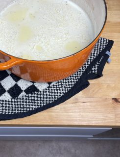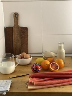 A very talented cook and dear friend of mine started posting about her daily soup methods, lovingly calling them ‘slop.’ It became a word that I have loved ever since, even though it also mirrors somewhat the feeling of January, the seemingly longest month of the year and the weather that comes with it. The excitement for rhubarb, however, is nothing but pure joy; an earthy and wild pinkesque glimmer of hope, a reminder that after a sturdy and sour season, with a little effort and patience, things can get sweet again. Accompanied by its pal from down south, the blood orange, it revisits us around the same time of the year, creating a thick layer of hugging custard and, yes, quite some sugar, for a bright and indulgent slop. Easy to make and hard to resist.