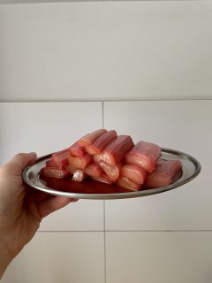 300g forced rhubarb, washed, trimmed and cut into 4cm pieces